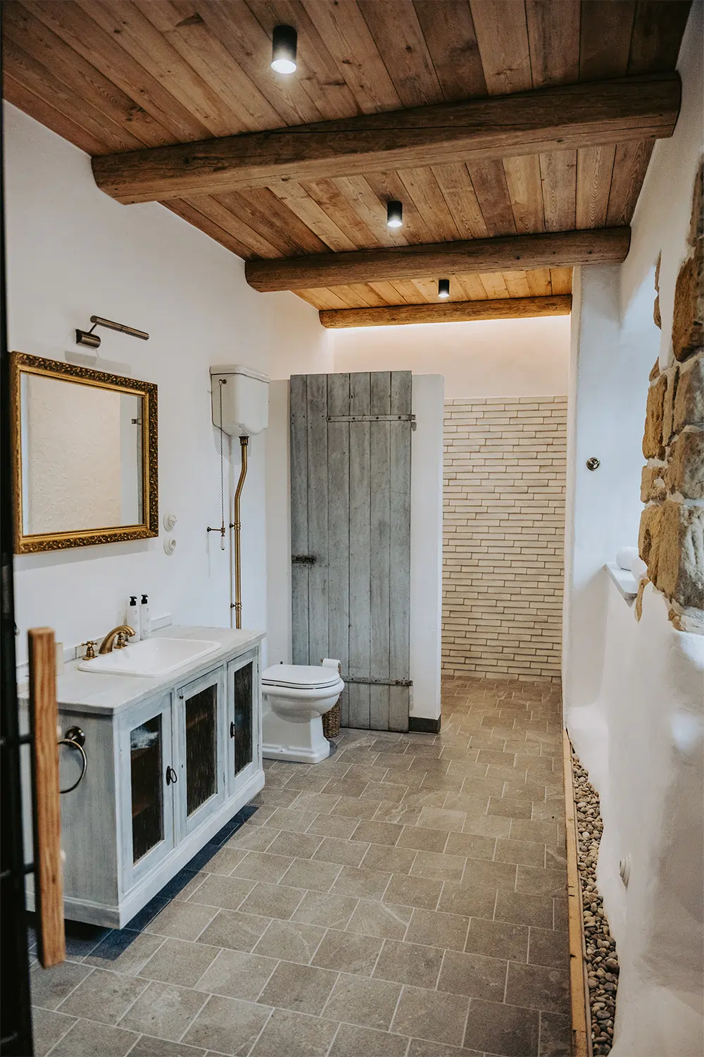 Experience the authentic atmosphere of mill living. Our OLD ROOM is located on the site of the original living room, which inspired the entire interior. It is based on sandstone walls, wooden flooring and blue colour, highlighting the essence of the country mill style. Thanks to the east-facing windows, the room is bathed in sunlight all day long. The light and sandstone are reflected in the black glass wall that separates the room from the bathroom, adding a unique charm to the space.