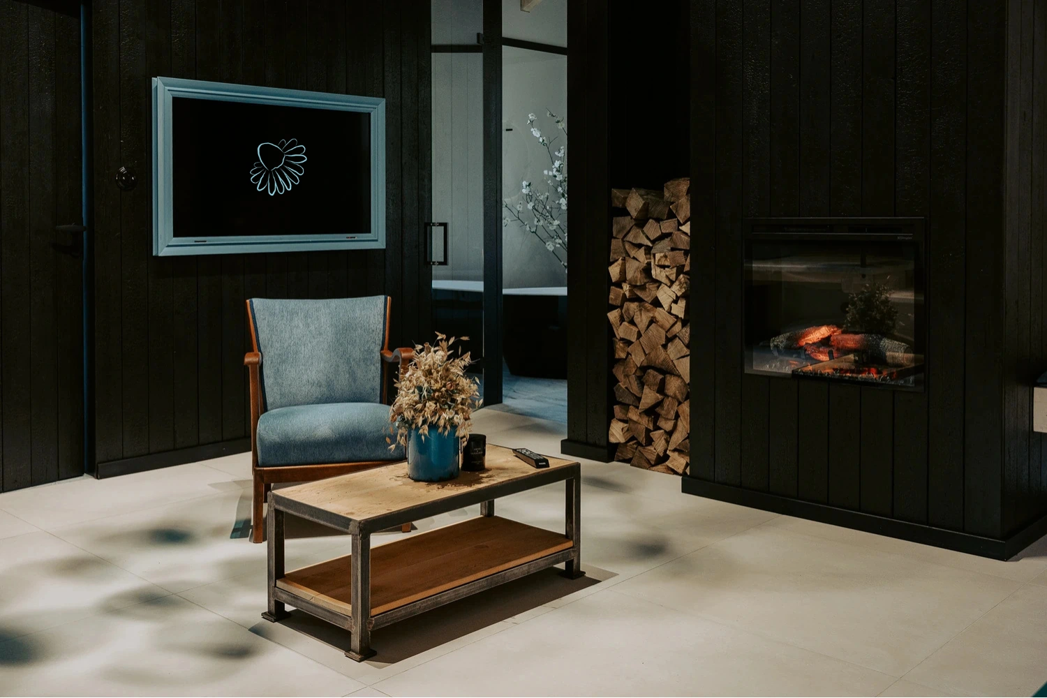 It's hard to talk about a mill without a mill wheel. And that is why we can offer our exceptional guests an unforgettable experience in the WATER room. Watch the never-ending water cycle from the comfort of your bed in our largest room. Peacefully watch as the eight-metre mill wheel turns with the power of the water current. Stone walls, a fireplace, oak beams and a stylish chandelier complete the overall atmosphere of tranquility. You can also enjoy the water in a freestanding black bath overlooking the meadows and barn.